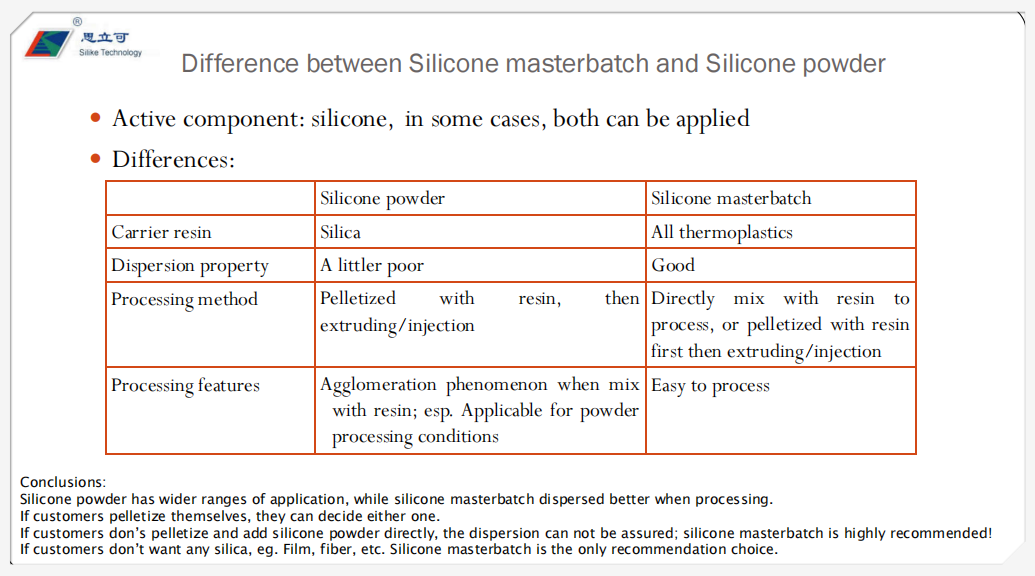 Għalkemm it-trab tas-silikon u l-masterbatch tas-silikon għandhom l-istess ingredjent ewlieni (PDMS), l-użu u l-prestazzjoni tagħhom ivarjaw b'mod sinifikanti.